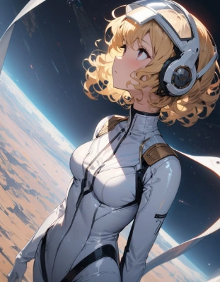 ((masterpiece, best quality, extremely detailed, absurdres)),Science fiction, girl floating in weightless outer space, blonde, short hair, naturally curly hair, slim white bodysuit, transparent helmet, looking up (looking away: 1.4)