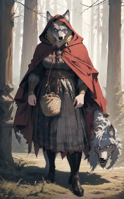 (masterpiece),best quality,(perfect anatomy,perfect image,high quality image,high resolution),extremely detailed CG,fine line drawing,ultra-detailed,full body shot,husband and wife standing,((a wife is human),wife is beautiful child standing deep Forest,blonde hair,long hair, blue eyes,red hooded cape,(hood up),holding basket,Kilt),(((a husband is (a wolf-giant) in sky,huge wolf head behind wife))),horror,((dark tone,realistic,hyper realistic character,high detail))