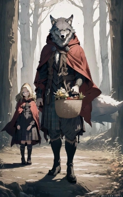 (masterpiece),best quality,(perfect anatomy,perfect image,high quality image,high resolution),extremely detailed CG,fine line drawing,ultra-detailed,full body shot,husband and wife standing,(((wife is beautiful human child)),standing deep Forest,wife is petite-girl has blonde long hair,blue eyes,she wearing red hooded cape,(hood up),holding basket,Kilt),(((a husband is (wolf-giant),he standing behind wife:1.2))),horror,((dark tone,realistic,hyper realistic character,high detail))