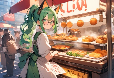 ((masterpiece, best quality, extremely detailed, absurdres)) girl (mushroom-witch:1.2) Flat-Chest (silver-short-bob-hair) red-eyes (mushroom-witch-hat:1.2) gray-duffle-coat (smile: 1.2) speech-question break steam-punk-style town streetride on shopping-cart break food-cart food-stall table (baked-mochocho:1.2) in paper-box .Break (colorful-mushroom:1.2) breaksignboard.(Drawn on it and the words “imagaWayaki” written on it.)(Drawn on it and the words “Oyaki” written on it.)(Drawn on it and the words “KaiTenYaki” written on it. ),(Drawn on it and the words “Opanyaki” written on it.) ,,,,