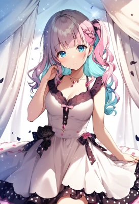 masterpiece, best quality, A woman stands in a fantasy cave. Her costume is a white robe with fine lace trimmed with pale pink flowers. Her hair has long, delicate curls and is adorned with pale pink floral decorations. In the background is a mineral wall that glows in blues and purples, and the sound of dripping water can be heard. At the center of the cave is a large crystal, through which light shines. In her hand, she holds a bouquet of warm colors, and the vivid colors are impressive. She stands gracefully, her expression calm and graceful., with blush cheeks, official art, {{ultra-detailed}}, {{high resolution}}, dynamic fuzziness, colorful, cowboy shot, underwear, girl ,solo, navel, lying on canopy bed,
