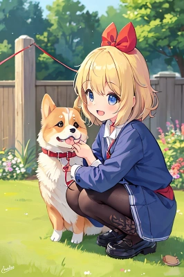 1girl, solo, young, child, blonde hair, blue eyes, short hair, red ribbon, hair ribbon,(hair bow:1.4),red bow, corgi, dog, pet, leash, collar, tied up, looking at animal, sparkling eyes, excited, happy, smiling, adorable, cute, kawaii, crouching, reaching out, petting, garden, backyard, fence, doghouse, trees, bushes, grass, sunny day, (detailed girl:1.4), (detailed hair:1.3), (detailed face:1.4), (detailed eyes:1.4), (detailed corgi:1.4), (detailed leash:1.2), full body, side view, animal interaction, heartwarming, anime, digital painting, (masterpiece:1.4), (best quality:1.4), (high detail:1.3), (intricate:1.3), (photorealistic:1.1), vibrant colors, soft lighting, depth of field, idyllic atmosphere