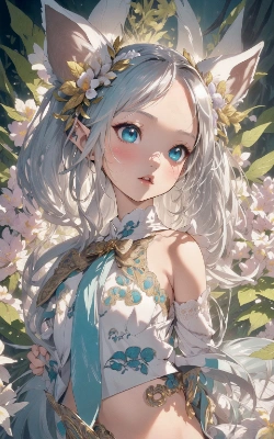 (masterpiece),perfect anatomy,best quality,intricate,(elf),cinematic lighting,shading,super detailed skin,(illustration),ultra-detailed,(extremely delicate eyes:1.2),(a girl,girl face,petite,slender,(silver hair),(Hatsune miku),(Forehead,tightfabric in vibrant white with gold),(cowboy shot,extremely detailed crop-top),(leaf pattern embroidery:1.2),((hyper realistic character,high detail)),(fantastical atmosphere,sisurrounded by various flowers),vibrant colour,light and shadow