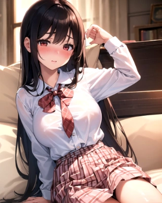 (extremely detailed:1.5), (1 pure innocent girls), very cute face, young face, like idols, (blush:1.3), big breasts, (white school uniform), (brown gingham skirt),(red ribbon tie),(frightened), (hotel),sit on sofa,black hair,long hair,straight hair, perfect face, detailed face, (hyper realistic:1.2), 8k cg wallpaper, (cowboy shot),blue sky