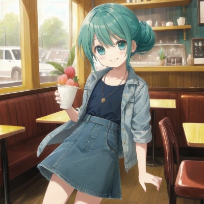 masterpiece, best quality, highres, 1otoko no ko, solo, Striped shirt, Farmer’s Overalls, boots, かわいい, flat chest, aqua hair, aqua eyes, half updo, smile, peach, Orchard<lora:flat2:0> <lora:hairdetailer:0.5>