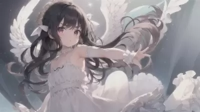 ((1 little girl, thick eyebrows, wavy black hair, blown eyes, angel wings, two tone dress)),