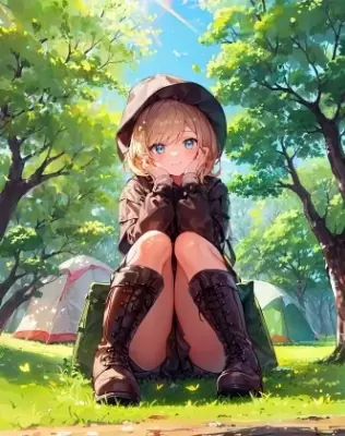 (from below:1.35), (front view:1.35),upper body, [(focus on girl:1.3)::15], (focus on Leather Camping boots), zoom on girl,