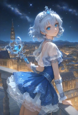 photorealistic, realistic, lifelike, incoming, looking at viewer, dark forest, {{{light smile}}}, heroine, the little sturdy magical girl, clear silver inward curl short hairs , short sleeve beautiful indigo dress with embroidery, fair skin, cute detailed eyes, blue eyes, a gripped miracle staff , elegant short gauntlets , elegant long greaves , armlets, miracle jewel, short cloak , princess tiara, night, fog, {{{kawaii, brave, cute, kawaii}}}, best quality, best detailed, , best quality, amazing quality, very aesthetic, absurdres