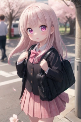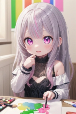 masterpiece, best quality, extremely detailed, anime <lora:flat2:0> <lora:hairdetailer:1> , girl, superlonghair, puff sleeve, silver hair in pink hair, pink eyes, watercolor,RAINBOWcolorBubble,openchest,offshoulder,glamorousbust,accessory,Heart,PeachWorld,Peach,love,fruits,, Double Tooth,