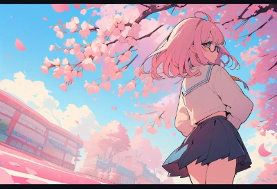 masterpiece, best quality, beautiful detailed eyes, ultra-detailed, finely detail, highres, perfect anatomy, colorful, Kyoto Animation, (1 cute girl), solo, simple background, retro style, (1990s city pop art style), (city pop anime), retoro anime, RETRO ART STYLE, NEON_POP ART STYLE, sky, glasses, (school uniforms), mouth open, double teeth, double tooth, cute smile, cute illustration, fuwafuwa illustration, high school girl, pastel colors, (portrait), (peace sign), detailed and intricate, (inkpunk, inkpunk style), (watercolor painting),