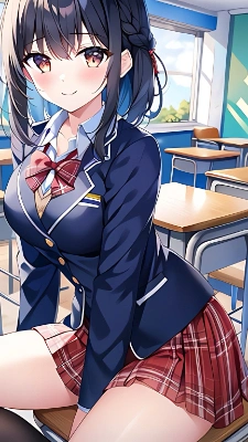 1girl, solo, breasts, looking at viewer, blush, smile, bangs, skirt, large breasts, shirt, black hair, long sleeves, bow, ribbon, brown eyes, sitting, closed mouth, school uniform, jacket, hair ribbon, white shirt, braid, thighs, pleated skirt, collared shirt, indoors, bowtie, red bow, plaid, window, red skirt, plaid skirt, chair, blazer, blue jacket, red bowtie, desk, between legs, hand between legs, classroom, school desk