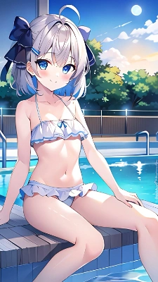 1girl, solo, looking at viewer, blush, smile, bangs, skirt, shirt, hair ornament, red eyes, hair between eyes, twintails, sitting, closed mouth, school uniform, blue hair, white shirt, short sleeves, pleated skirt, serafuku, indoors, black skirt, sailor collar, neckerchief, window, blue sailor collar, desk, black sailor collar, classroom, school desk, blue neckerchief, on desk, sitting on desk