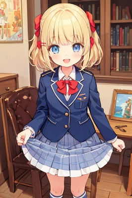 1 girl,loli,blond hair,short hair,(hair bow:1.2),red bow,blue eyes,standing,village, spring,cherry blossoms, smile,cinematic angle,long sleeves,