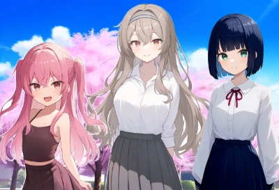 master piece,best quality,blue sky,Cherry trees,1girl, abstract background, upper body,hoodie,detached pants,{short hair},dark blue hair,straight hair,blunt bangs,malachite green eyes,bad mood,small breasts,girl,middle school students,14years old,smile,close mouth,relaxed,, best quality, amazing quality, very aesthetic, absurdres