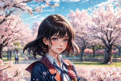 16K, ultra detailed, 1girl, depth of field, pastel colors, (fantastic:1.3), soft focus, soft lighting, Cherry blossom trees, (watercolor:1.4), gradation, blur the background,