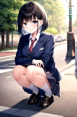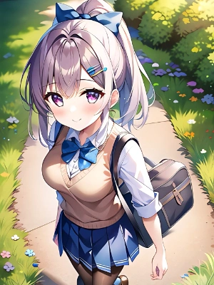 1girl, solo, long hair, breasts, looking at viewer, blush, smile, bangs, skirt, shirt, hair ornament, bow, medium breasts, closed mouth, school uniform, standing, purple eyes, white shirt, ponytail, flower, hair bow, pantyhose, sidelocks, pleated skirt, outdoors, shoes, hairclip, collared shirt, bowtie, bag, blue skirt, black pantyhose, from above, blue bow, grass, loafers, sleeves rolled up, sweater vest, school bag, blue bowtie