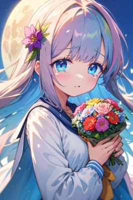 (ultra-intricate pupil in eyes, shiny eyes), long eyelashes, double eyelids, parted lips, kawaii, cute, , slender, (ultra delicate and beautiful skin), , perfect anatomy, dynamic angle, BREAK (masterpiece, best quality), (ultra-detailed 8K), (perfect design), absurdres, highres, ((blush)), (super fine illustration), ((light blue long hair))), 10 years old, long hair ((blush)), masterpiece, best quality, (amazing,blunt bangs), high resolution, cute face, masterpiece, best quality, extremely detailed, anime, beautiful girl, blue hair, wind, solo, depth of field, masterpiece, best quality, extremely detailed, (PHOTO BACKGROUND: 1.3), SMALL BREASTS,beautiful detailed eyes,,full body, sailor suit,Cherry The girlmasterpiece, best quality, extremely detailed, anime, graduation, girl, longhair, long sleeve, blue eyes, student, watercolor, masterpiece、Bouquet that fills the screen、Pretty girl buried in a bouquet of flowers、top-quality、masutepiece、1womanl、独奏、(abstract art:1.4),(Psychedelia Theme:1.6),(kosmos:1.4)、beautiful woman at the center of the universe、(Smiling with tears in her eyes:1.5),(A woman wrapping her hands around a large bouquet of flowers:1.4),A ray of light spreads,Number of stars spreading from the center,Spreading star fragments,prisma(Nostalgic atmosphere),(There are many flowers falling around me:1.3)、Dark scenery、Moon reflection、Reflects a lot of light and shines brightly、,