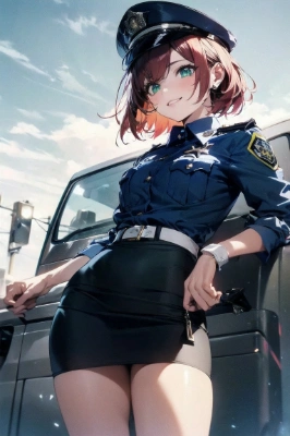 (masterpiece), (best quality),(ultra-detailed),(illustration),(extremely detailed),(perfect anatomy),(super detailed skin),(detailed),(beautiful detailed eyes),1girl,solo,, shorthair, red hair, green eyes,policewoman,police uniform,police,collared shirt,blue shirt,((pencil skirt)),police hat,blush,arms up,bound,rope,standing,((bound arms)),bound wrists,restrain,pole,below,brick wall,indoors,,
