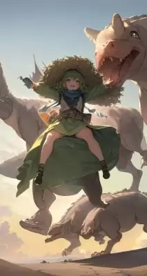 (masterpiece, best quality, illustrations:1.2), (highly detailed background, beautiful sky, very windy, beautiful palace, mountains, cloud: 1.3), (1girl, young girl, solo, bright emerald green hair, jewelry eyes, twinkle eyes, wearing iron armer and scarf, massive rucksack, whole body, big smile: 1.3), golden hour, cinematic lighting, (hands forward and spread out: 2), ((stegosaurus, brachiosaurus))