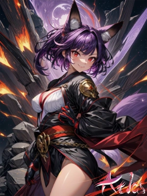 High resolution, Ultra detailed, best quality, 2girls, Grin, open mouth, ((single braid)) , brown hair, blunt bangs, (big breasts:1.0), (purple eyes), glamorous body, fox ears, fox tail, (25 years old), symmetrical posture, cheek-to-cheek:1.4, ((kimono:1.5))