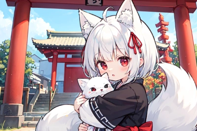 masterpiece, best quality, extremely detailed, anime, girl, skirt, dried flower, girl, ahoge, longhair, garter belt, white hair, red eyes, fox girl, chibi character, witch, magic, plant, ruins, sunset,essential oils,Smile,Atelier,,