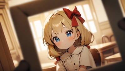 masterpiece, best quality, very aesthetic, absurdres,anime-style girl, loli,1girl, solo, outdoor, photoshoot, holding_camera, happy, excited, short_hair, blonde_hair, blue_eyes, hair_bow, red_bow,(hair bow:1.3),rede bow, pink_dress, white_cardigan, mary_jane_shoes, white_socks, small_girl, (young_age:1.2), beautiful_scenery, mountains, waterfall, clear_blue_sky, lush_vegetation, green_grass, wildflowers, sunlight, (lens_flare:1.1), from_side, side_view, eye_level_view