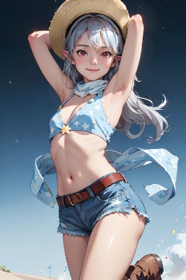 (big smile:1.6), (sexy cowgirl costume:1.2), (sleeveless (light-blue crop top) with (many small star-symbol print):1.4), (plunking neckline:1.4), ((bare shoulders, bare arms):1.3), ((collarbone, emphasize cleavage):1.3), (light-blue leather micro shorts with (many small star-symbol pattern):1.4), (light-blue Scarf:1.4),