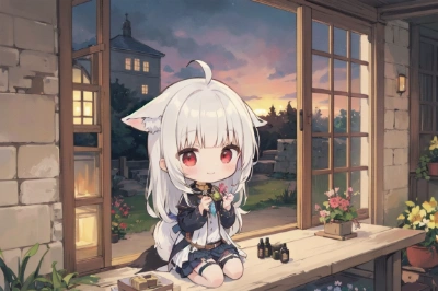 pixel, masterpiece, best quality, extremely detailed, anime, girl, skirt, camera, girl, ahoge, twintail, white hair, red eyes, fox girl, chibi character, witch, magic, different world, traveling, waving, SLR camera,Emit rays from camera<lora:pixel_f2:0.3> <lora:hime_style-1.0r8:1> ,