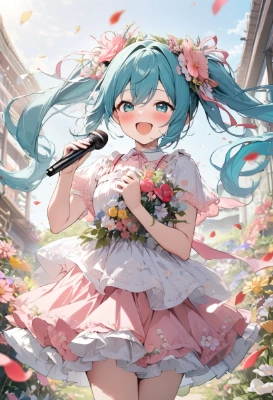 deltamon_beta , cat on head,blush,smile,great joy,:d,lots of cherry blossoms,Falling cherry blossom petals,breeze,Cat,Cats,spring sunshine,sit,masterpiece, best quality, extremely detailed, anime, girl, skirt, 1girl,deltamon_beta, solo, blue eyes, thighhighs, long sleeves,headband, dress, animal ears, shoulders, blue tail, earrings,pink boots, detached sleeves, green hair, sleeveless, cat ears, bag, white dress, white thighhighs, cat tail,pink backpack,yellow delta tie,pink randseru <lora:hairdetailer:0> <lora:deltamon_beta:1> upper body,