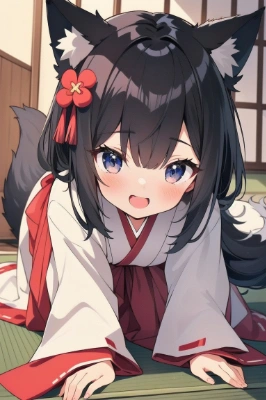 (black eye,fox girl,black hair,long hair,somewhat drooping eyes,childish face,(Smaller than average height)),(shrine maiden outfit,red hakama (e.g. worn by miko or noblewomen at court)), flower hair ornament,head shot,offertory box <lora:flat2:0> <lora:hairdetailer:0> ,night Time,cherry blossom,