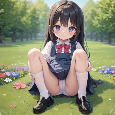 masterpiece,best quality,extremely detailed,2girls,loli,cute,(child:1.2),white blouse,pinafore_dress,cute panty,high socks,cute shoes,cute smile,sitting on grass,knees_together_feet_apart,hands_on_own_knees,in the riverside,panty_peek,(crotch_focus:1.3),front view,