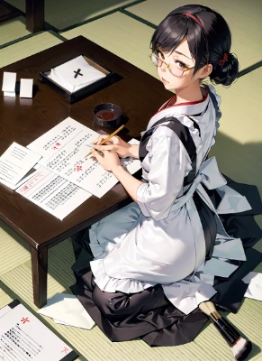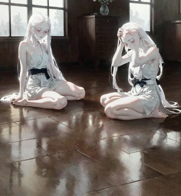 white shirt,blue skirt,leather brown shoes,black pantyhose,blonde hair tieing black ribbon,(looking down:1.3),retrospective:1.2,