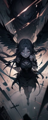 masterpiece,best quality,extremely detailed,(terror atmosphere:1.2),1girl,mature_female,terror goddess,glamor,black hair,long hair,bloody eyes,goddess mysterious dress,mysterious face,mysterious pose,(purgatory:1.2),(many dark angel flying above aerial:1.2),,