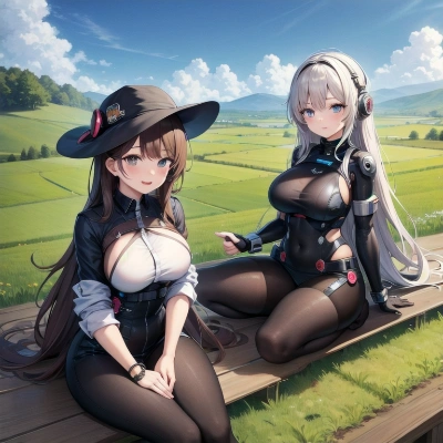 masterpiece,best quality,extremely detailed,2girls,bishoujo,cyborg,cyborg body,curvy,farmer costume,farmer hat,relaxed look,they are plowing the field,countryside scenery,