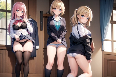 masterpiece,best quality,extremely detailed,five girls,12 years old,skinny,small bretasts,(open clothes:1.2),white blouse,pinafore_dress,cute underwear,high socks,school shoes,a cute smile,(undressing:1.4),(show underwear:1.4),school dressroom,