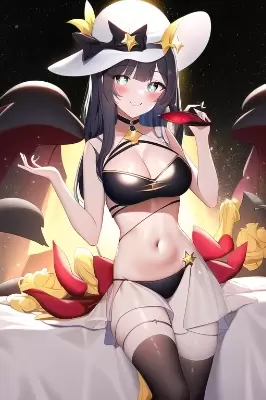 巧みに描かれし極上の画のように、煌めく美しき細部に溢れる少女がいた。彼女は蒼き髪が優雅に乱れ舞い、長き前髪は繊細な顔立ちを彩る。瞳は輝く宝石の如く美しき細部が際立ち、ほほえみは優しく暖かな輝きを放つ。美しい腹部には、なぞるようなへそが輝く宝石のように輝く。 空に浮かぶ宮殿を背景に、優美な蝶の翅が舞い踊る。白い手袋に包まれた手は優雅に添えられ、瞳の間に掠れる髪は一筋に整えられた。黒いリボンと白い蝶ネクタイが織り成す装飾が美しい魅力を放つ。 胴回りには大きなおおきな袖がふんわりと広がり、豊かな胸元が女性らしさを際立たせる。微笑む表情は心を和ませる温かさがあり、魔法少女と着物が織り成す独特の融合が腹部の前で目立つ。へそを中心に見事に切り抜かれた肌が、美しい腹部と腰回りを彩る。 細く白い靴下に包まれた脚は美しく、砂のように滑らかなサンダルが足元を飾る。長い髪は風になびき、すらりとした細い足が繊細な脚線美を魅せる。 美しく緻密なディテールが心を奪い、空想の世界へと誘い込む。 谷川流さんの文体で書きました。