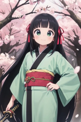 1 girl,(((very longest hair))),black hair, smile,straight Hair,hair ribbon,mintgreen stripe,Black Eyes,flat chest,straight Across bangs,princess Cut, Very Long Sideburn,roundry Head,Droping eyes,cute,Meekness,Bob Cut,long back hair,12 years Old, kimono,cherry blossom,library