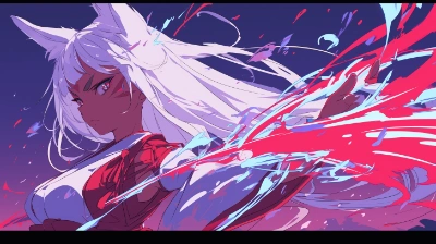 anime cel, stylish action, fast motion, killer queen, beautiful cute dark-skinned girl, japanese miko clothes, silk texture, white hair, fox ears, thick eyebrows, imaginary lighting, --ar 16:9 --niji 6