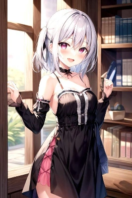 1girl, solo, long hair, breasts, looking at viewer, blush, smile, open mouth, bangs, skirt, large breasts, brown hair, shirt, red eyes, thighhighs, long sleeves, ribbon, twintails, medium breasts, standing, hair ribbon, :d, thighs, cowboy shot, pleated skirt, necktie, collared shirt, belt, miniskirt, white thighhighs, red ribbon, zettai ryouiki, black shirt, red skirt, from below, red necktie, pink skirt