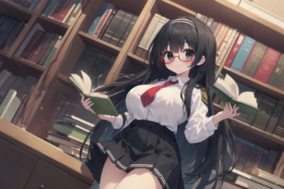 Wears glasses, elementary school student, black hair, black eyes, round, wears school uniform, is tall, is in the library, looks kind, has very large breasts, has long hair that reaches her waist, is reading a book, He has black hair but has a slight brownish tint, wears a headband, wears a black uniform, black skirt, white shirt, red tie, and black jacket,, She smiles wryly.,,