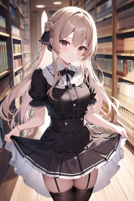 1girl, solo, long hair, looking at viewer, bangs, blue eyes, skirt, brown hair, shirt, bow, holding, closed mouth, school uniform, standing, white shirt, short sleeves, cowboy shot, pleated skirt, collared shirt, indoors, bowtie, black skirt, blurry, book, black bow, blurry background, holding book, black bowtie, bookshelf, library