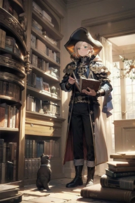 お題の「図書室」にちなみ、拙著、大航海時代風異世界を舞台にした海洋冒険ファンタジー小説 『El Pirata Del Grimorio ~魔導書の海賊~』 (※下記URL参照) の主要キャラ、魔術師でもある海賊の船長、マルク・デ・スファラニアが強奪した禁書の魔導書を収めたアジトの図書室にいるところを作成。 こちらも多少服装に気に入らないとこあるけど、それなりになった一枚。