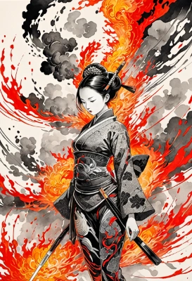 Ink Wash Mastery, Comcept art, 1girl, battle, cute sexy, hot, Anatomically correct, Modern japanese color, Surreal art, Classical, Masterpiece, Best quality, Extremely detailed, epic, parfect hands, parfect face, (Motion Graphics–v4), (Burning-Edge–v4), (action-lines–v4), japanese traditional style, (dynamic angle),