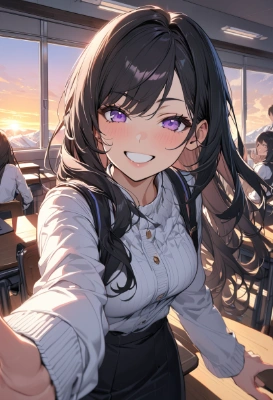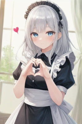 (best quality:1.6), (ultra detailed:1.4), (insanely detailed:1.2),( beautiful:1.2), highres, 8K ,(Sending heart pose with both hands 1.6) (Maid with long black hair and purple eyes 1.4) <lora:hairdetailer:1> <lora:eyecolle_mukuge_v100:1>