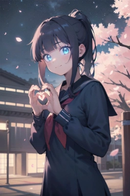 masterpiece, best quality, extremely detailed, anime, upper body, a girl, ponytail, blunt bangs, black hair,light smile, narrow eyes, ((navy colored sailor suit)), long sleeve, navy high socks, loafers, standing, (heart hands), cherry blossoms, cherry blossom petals, blue sky, high school, reinforced concrete school building <lora:yawanuri:1> <lora:siitake-eye:1> ,