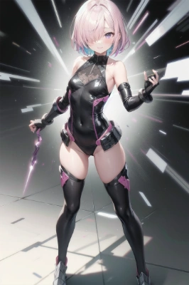 1girl,masterpiece,best quality,Ultra high definition eyes,8k,Beautiful detailed eyes,Fine and beautiful eyes,finely detail,extremely CG, absurdres,high resolution,illustration,Detailed and beautiful outlines,finely detail,high resolution,(colorful refraction:1.4,Increase saturation:1.2),beautiful lighting,dynamic lighting,closed room,black background,simple background, source_anime, mashkyrielight,<lora:mash-kyrielight-ponyxl-lora-nochekaiser:1>, mash kyrielight, full body, smile,looking at viewer,standing,beautiful fingers,short hair, purple eyes, pink hair, hair over one eye, gloves, bare shoulders, elbow gloves, armor, black armor,,