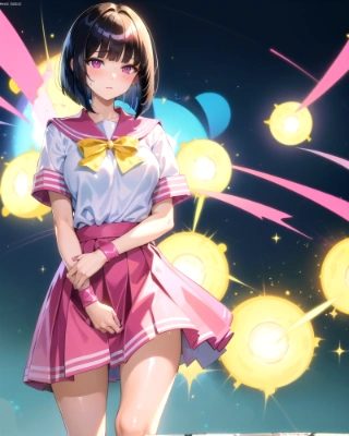 masterpiece, super fine illustration, best quality, light particles, ultra-detailed, 8K wallpaper, (bright colors:1.2), (a little girl),(high school uniforms), ((black hair, medium hair, bob cut)),small breasts,disheveled hair, , shiny hair, shiny skin, , sweat, girl is soaked, (extremely beautiful pink eyes),arched back,