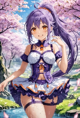 masterpiece, best quality, extremely detailed, anime, a pretty woman, (genshin impact),klee,blonde hair,orange eyes,,pointy ears,red dress,red headwear,brown footwear,backpack,bag,brown bag,brown gloves,cowlick,dress,gloves,hat feather,long sleeves,(white bloomers),bloomers, wet hair, garter belt,,