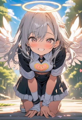 masterpiece, best quality, extremely detailed, anime ,happiness,beautiful,so cool,long pans,a pretty woman,night, <lora:flat1:1> <lora:flat2:1> <lora:hairdetailer:1> <lora:darkness_v100:1> <lora:sensualface_type2:1> angel wings,angel halo,Silver Hair,i love you,hearts,Black long pants,Blushing,Fingers are open or clenched fist or grabbing or making a peace sign or good job sign,Sacred Radiance, blessing ,Full of energy,see through ,,