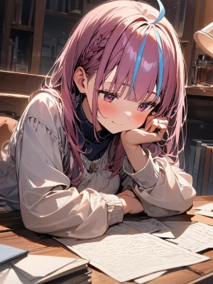 a girl leaning on her hand, deep in thought as she writes a letter. The scene should convey a sense of introspection and concentration as the girl reflects on her thoughts while composing the letter. The girl should be portrayed sitting at a desk or table, with her head resting on her hand and a pen or quill in the other hand as she writes. Her expression should be focused and contemplative, with perhaps a furrowed brow or a thoughtful gaze as she concentrates on her writing. The setting should be a quiet and peaceful indoor environment, with elements such as a writing desk, scattered papers, and soft natural light streaming in through a window to provide context. Ensure that the overall composition captures the girl's deep in thought as she writes the letter